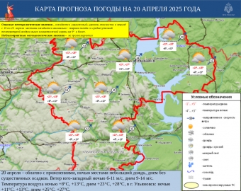 20 апреля — облачно с прояснениями, ночью местами небольшой дождь, днем без существенных осадков. Ветер юго-западный ночью 6-11 м/с, днем 9-14 м/с. Температура воздуха ночью +8°C, +13°C, днем +23°C, +28°C, в г. Ульяновск: ночью +11°C, +13°C, днем +25°C, +27°C.