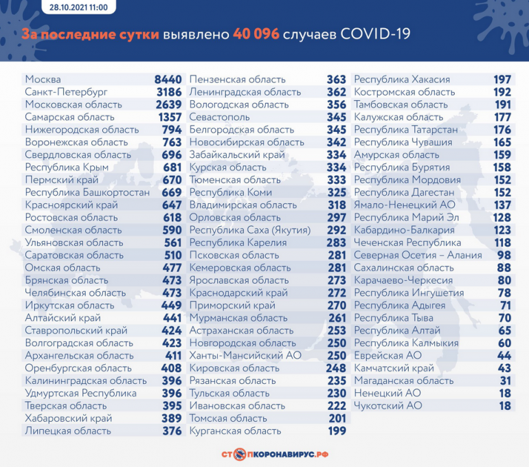 За последние сутки в России выявлено 40 096 заболевших COVID-19 в 85 регионах, в связи с выздоровлением выписано 29 318 человек, подтверждено 1 159 летальных исходов.