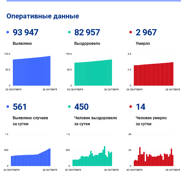 По данным федерального оперативного штаба на четверг, 28 октября, за сутки в Ульяновской области подтвердилось 14 смертей от коронавируса, вылечилось 450 человек, заразился 561.