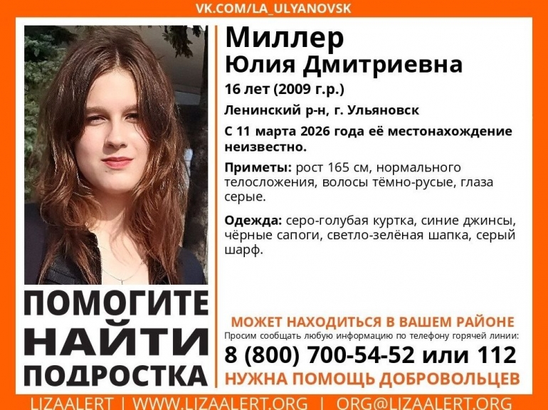 Сегодня, 11 марта, в Ленинском районе Ульяновска пропала 16-летняя местная жительница Юлия Миллер.