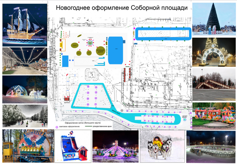Также на Соборной поставят новогодние фигуры (Дед Мороз и Снегурочка, танцующие пары, корабль, карета, арка и т.д.). Входные группы оформят ёлочными арками. Ярмарочная зона с домиками разместится в Троицком переулке.