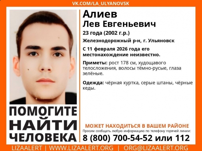Вчера, 11 февраля, в железнодорожном районе Ульяновска пропал 23-летний местный житель Лев Алиев.