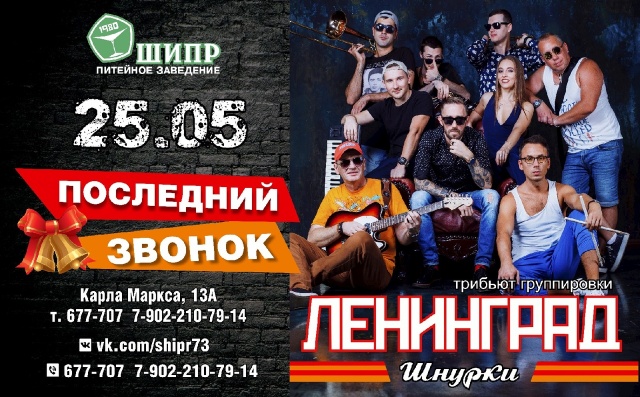 Кто- то скажет, что Последний звонок бывает раз в жизни, но мы ломаем все стереотипы и приглашаем 25 МАЯ на ПОСЛЕДНИЙ ЗВОНОК в ШИПРе, и, конечно, всех ждет невероятная шоу программа, яркие эмоции и качественная музыка в сопровождении сумасшедшего драйва, под лучшие хиты группировки «ЛЕНИНГРАД» от зажигательной группы «ШНУРКИ»- трибьют коллективу Сергея Шнурова.