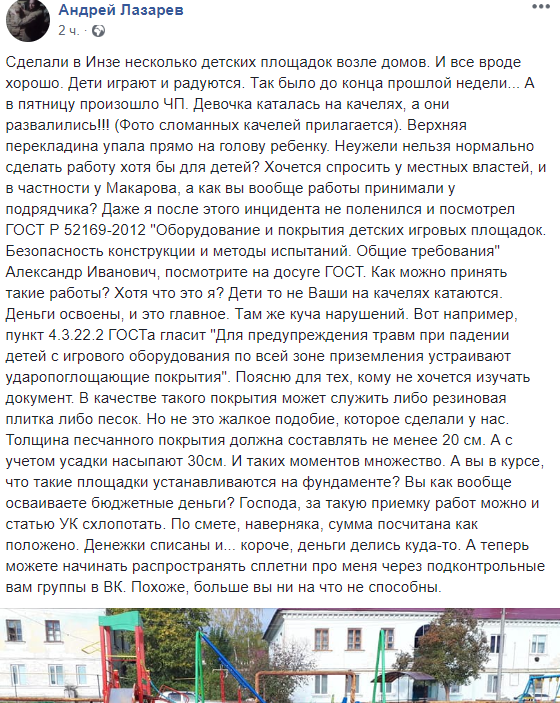 Об этом в соцсети сообщает местный житель Андрей Лазарев. Он обращается к районным властям с вопросами: Неужели нельзя нормально сделать работу хотя бы для детей? Как вообще принимали работы у подрядчика? Мужчина после этого инцидента посмотрел ГОСТ Р 52169-2012 "Оборудование и покрытия детских игровых площадок." и нашел много нарушений на данной детской площадке. В частности, по ГОСТу для предупреждения травм при падении детей с игрового оборудования по всей зоне приземления устраивают ударопоглощающие покрытия.