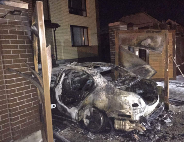 В результате пожара огнем повреждены ворота гаража, стена и вещи, которые там находились. Сам гараж закопчен, как и внешняя фронтальная стена дома. Также повреждены въездные распашные ворота, а «Мерседес» сгорел полностью.
