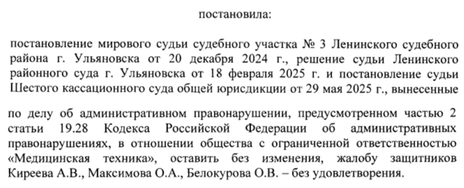 Мировой суд оштрафовал «Медицинскую технику» по ч. 2 ст. 19.28 КоАП РФ (незаконное вознаграждение от имени юридического лица, в крупном размере) на 10 млн рублей. Решение утвердил Ленинский районный и Шестой кассационный суды.