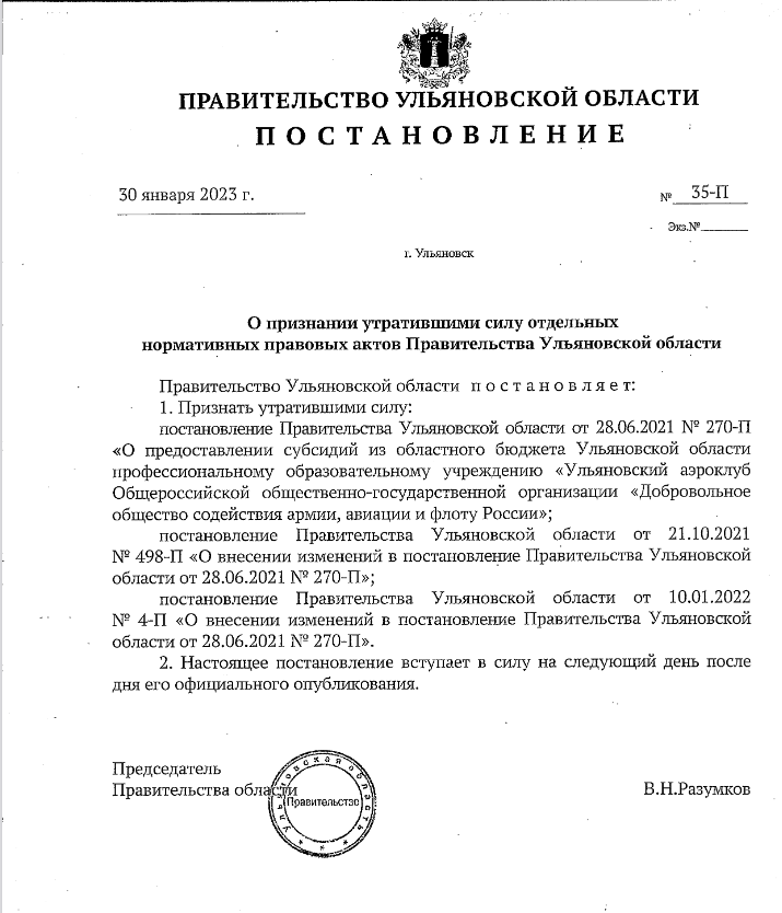 Согласно документу, признается утратившими силу Постановление № 270-П от 28 июня 2021 года «О предоставлении субсидий из бюджета Ульяновской области профессиональному образовательному учреждению «Ульяновский аэроклуб Общероссийской общественно-государственной организации «Добровольное общество содействия армии, авиации и флоту России».
