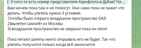 - Для тех, кто должен вылетать в ОАЭ в ближайшие дни: Ожидаются официальные заявления от МИДа и решения туроператоров по аннуляции/переносу туров. Появляются нюансы по отмене заявок без штрафов.