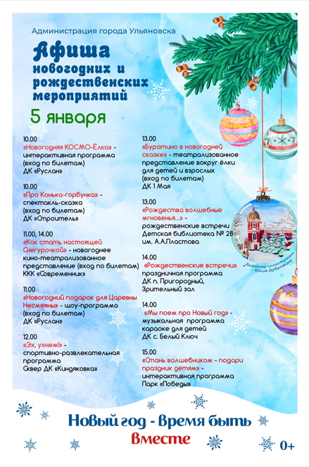 В Ульяновске продолжаются новогодние и рождественские мероприятия. Городское Управление культуры опубликовало афишу на завтра, 5 января.