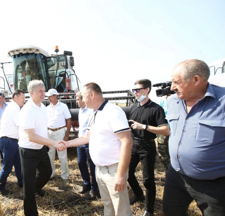 Глава региона Алексей Русских приехал поздравить аграриев с событием. Его угостили караваем из нового урожая зерна.