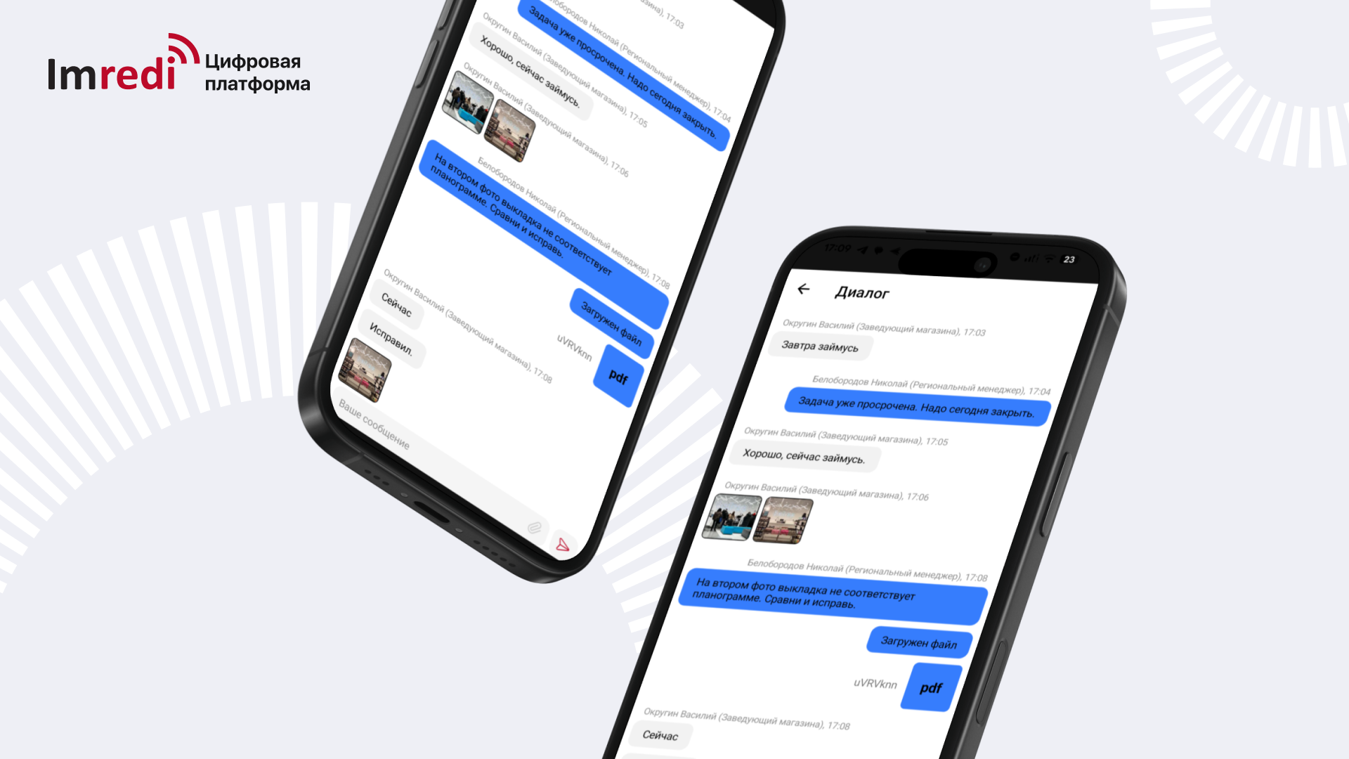 Возможности приложения Imredi позволяют ставить задачи и вести обмен информацией во встроенном чате, «упаковывать» процессы проверки магазинов в цифровые чек-листы, настраивать автопостановку задач при обнаружении отклонений (контроль также берет на себя Imredi, напоминая о сроках и подсвечивая несоблюдение дисциплины) и многое другое.