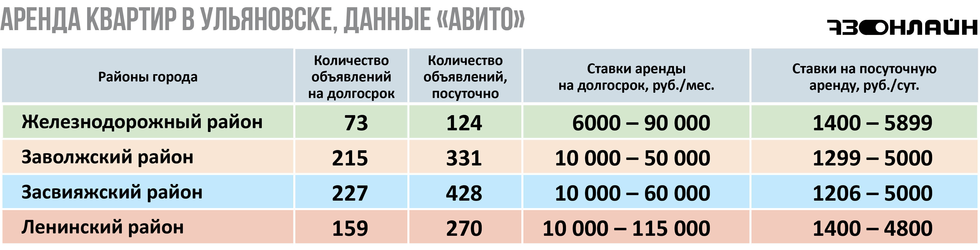 Больший ассортимент и посуточных, и помесячных квартир — в Заволжье и Засвияжье. Жилье в краткосрок в этих районах можно найти дешевле, в Ленинском и Железнодорожном районах минимальные ставки выше. Вдолгую самые дешевые квартиры в Железнодорожном районе — от 6 тыс. руб. в месяц, но разрыв между самыми доступными и самыми дорогими в Киндяковке и в центре Ульяновске наибольший.