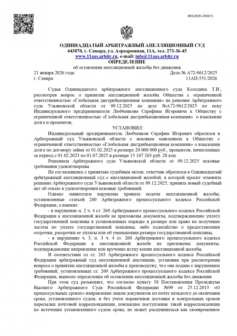 Напомним, в 2022 и 2023 годах между Любченковыми и ООО «ГДК», учредителем которого с мая 2023 года выступает компания Романа Арифуллина «Облачная дистрибьюция», были заключены договоры займов на 130 млн рублей. Деньги, как выяснилось позже в суде, выдавались под проценты. До начала 2024 года они уплачивались согласно договорам. Затем возникла просрочка, а вскоре «ГДК» и вовсе перестала исполнять обязательства. Летом 2025 года Любченковы отправляли в адрес компании претензию с требованием оплатить задолженность и проценты. Но денег владелец «Гулливера» и его сын так и не увидели, после чего решили подать иски на 231,3 млн рублей.