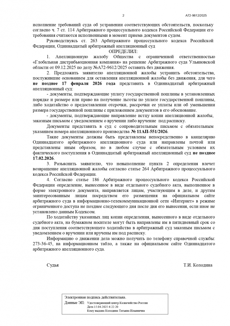 Согласно определению суда, недостатки в апелляционной жалобе представителя ООО «ГДК» предлагается устранить до 17 февраля.