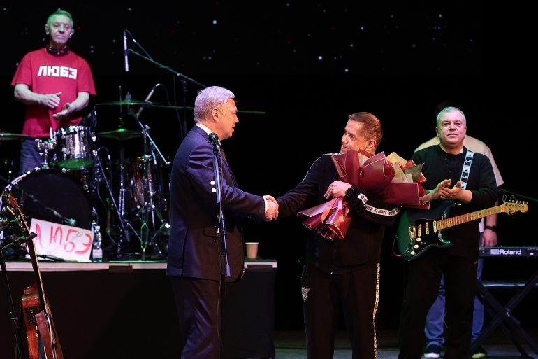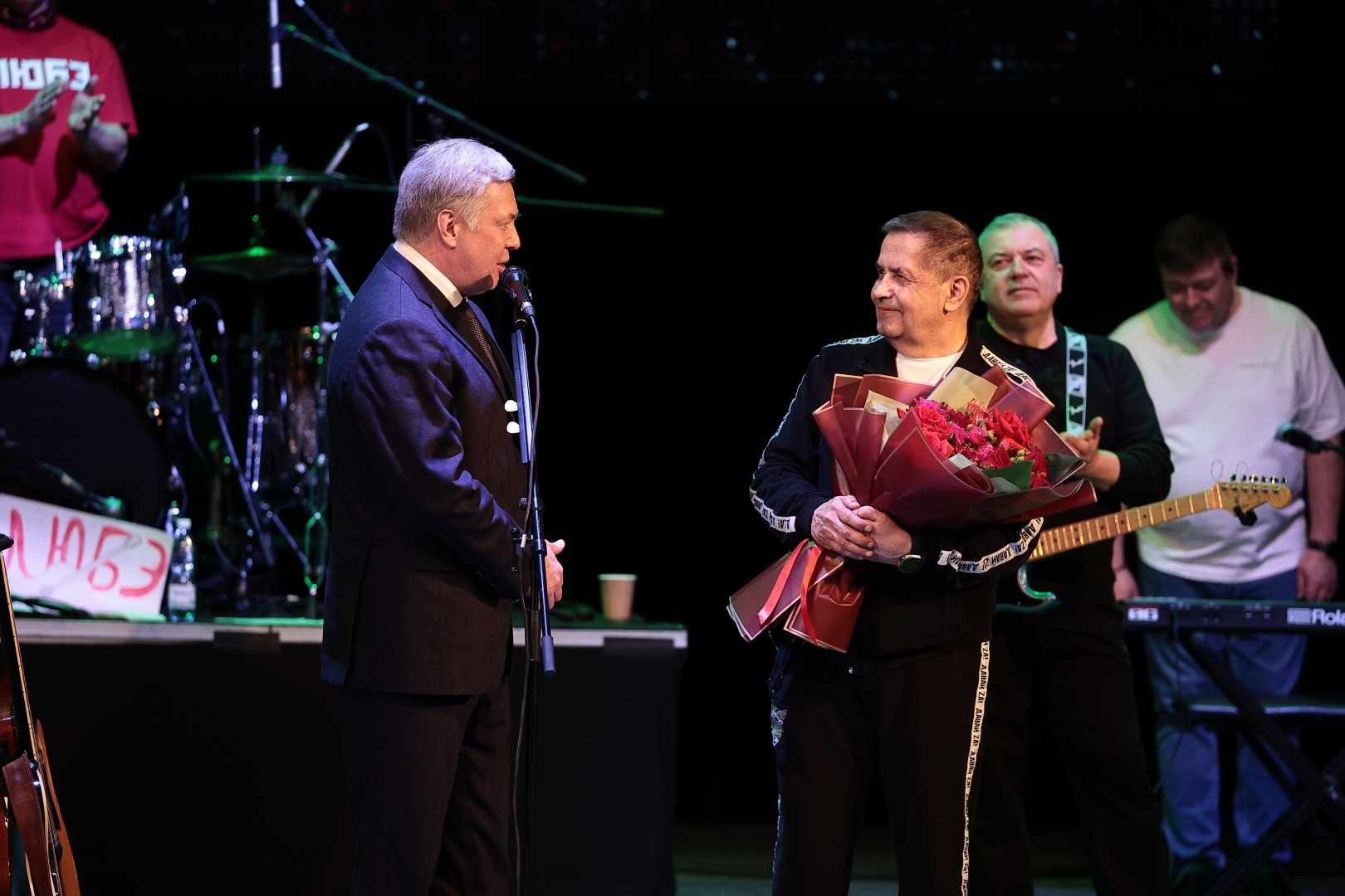 Двухдневный аншлаг «Любэ» в «Губернаторском» завершился на позитивной ноте. Финальную точку в гастролях легендарного коллектива поставил глава региона Алексей Русских. Губернатор поднялся на сцену с внушительным букетом ярко-красных роз.