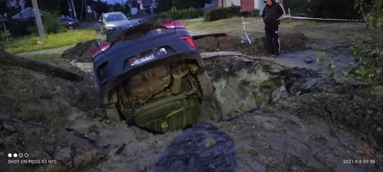 Как сообщают очевидцы, ночью 8 сентября автомобиль такси "Киа" въехал в яму на улице Толбухина, 15. Она осталась якобы после коммунальных раскопок.