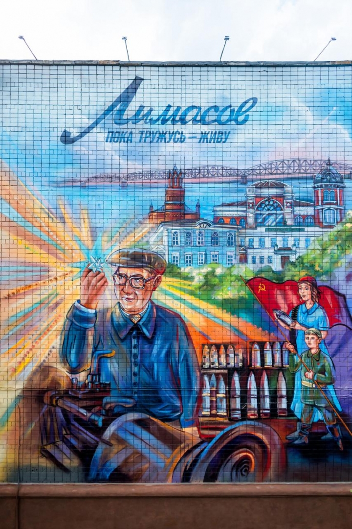 Работа расположена на стене Ульяновского колледжа градостроительства и права на Любови Шевцовой, 57.