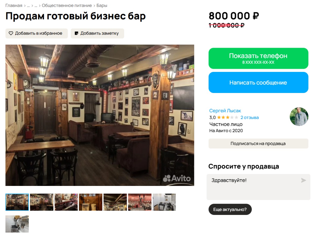 На «Авито» появилось объявление о продаже готового бизнеса — бар с настойками под названием «Малыш&Ко», расположенный в Молочном переулке, 6 выставлен на продажу 16 октября за ₽800 тыс.