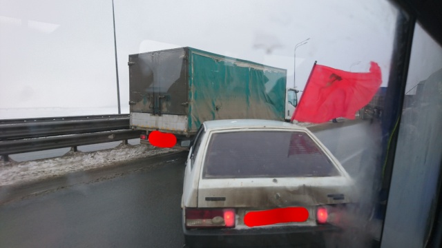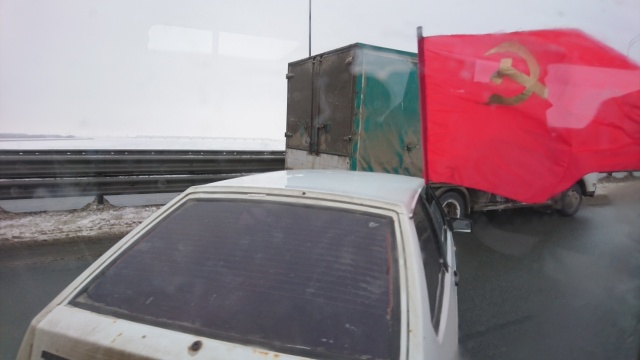 Сегодня, 25 декабря, в Ульяновске на Президентском мосту в сторону старого города белая «восьмёрка» (автор поста назвал её "девяткой"), над которой реял флаг СССР, перекрыла дорогу.