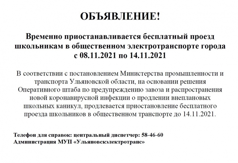 В соответствии с постановлением Министерства промышленности и транспорта Ульяновской области, на основании решения Оперативного штаба по предупреждению завоза и распространения новой коронавирусной инфекции о продлении внеплановых школьных каникул, продлевается приостановление бесплатного проезда школьников в общественном транспорте до 14 ноября.