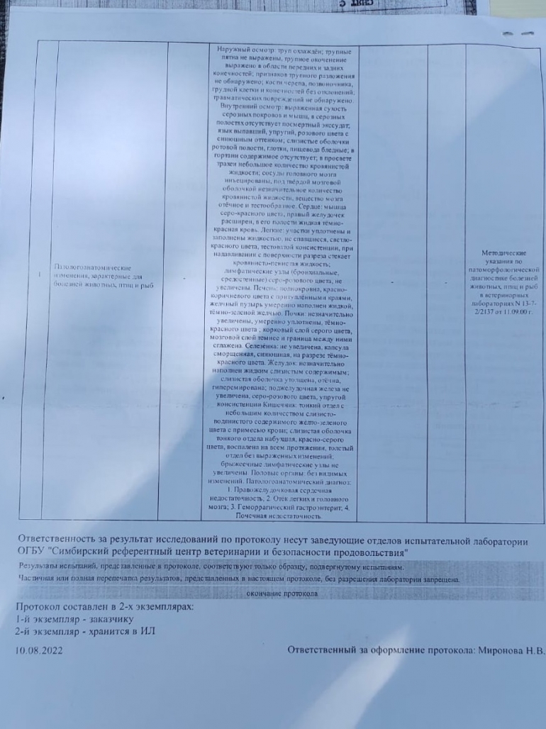 6 августа Дмитрий отвез Грома в Центр ветеринарии на 12 Сентября. Версия об отравлении подтвердилась после вскрытия. Патологоанатом разъяснил, что скорее всего пса накормили каким-то человеческим препаратом: есть множество лекарств, особенно противотуберкулезных, способных убить животное за полчаса. Следов конкретных веществ, доступных для «бытовой» покупки, в организме не нашли. Однако расширенная печень, кровоизлияние в мозг, несвернувшаяся кровь, отсутствие трупного окоченения также говорят об отравлении.