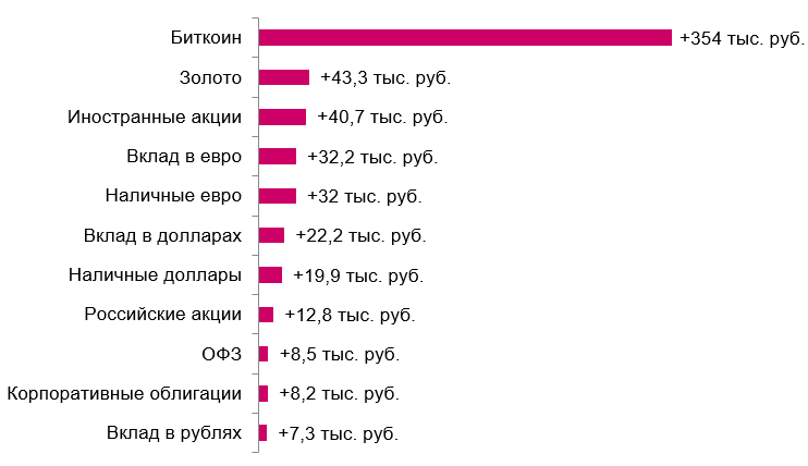 По данным FinExpertiza, наибольшую прибыль получили рисковые инвесторы, вложившиеся в биткоин. Приобретя криптовалюту на 100 тыс. руб. в первые январские дни 2020-го, к концу декабря можно было получить 354 тыс. руб. прибыли. Прилично заработали и вполне консервативные инвесторы, предпочитающие популярный антикризисный актив золото - 43 тыс. руб. Немногим менее принесли иностранные акции - около 41 тыс. руб. Наконец, хорошему доходу могли порадоваться и держатели валюты - те, кто в начале года купил евро, к концу года за счет разницы курсов получил на 100 тыс. руб. 32 тыс. сверху.
