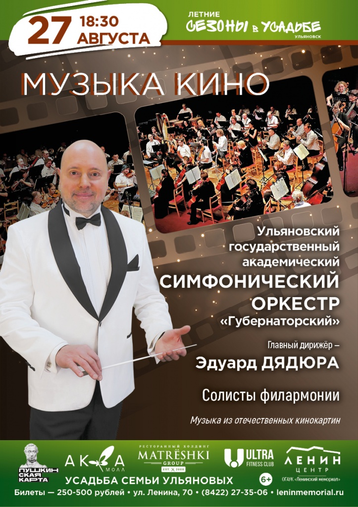 В День российского кино Ульяновский государственный академический симфонический оркестр «Губернаторский» под управлением главного дирижёра Эдуарда Дядюры и солисты филармонии исполнят мелодии и песни из популярных отечественных кинокартин.