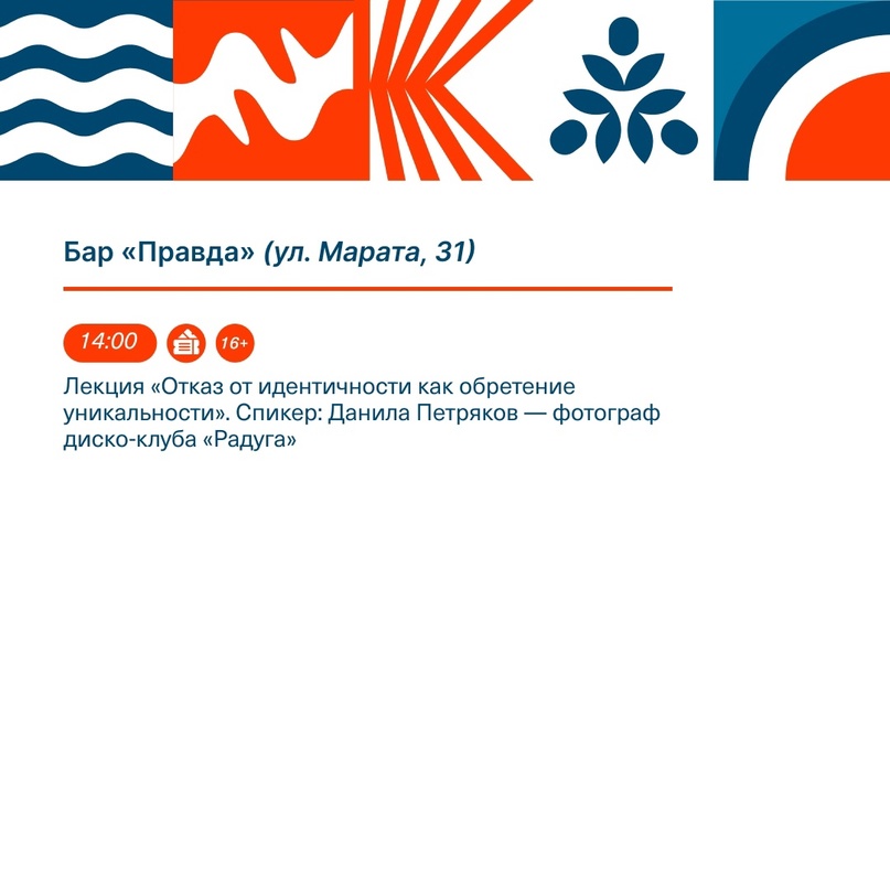 Лекция фотографа диско-клуба «Радуга» Данилы Петрякова «Отказ от идентичности как обретение уникальности» в баре «Правда» в 14:00. Регистрация по ссылке.