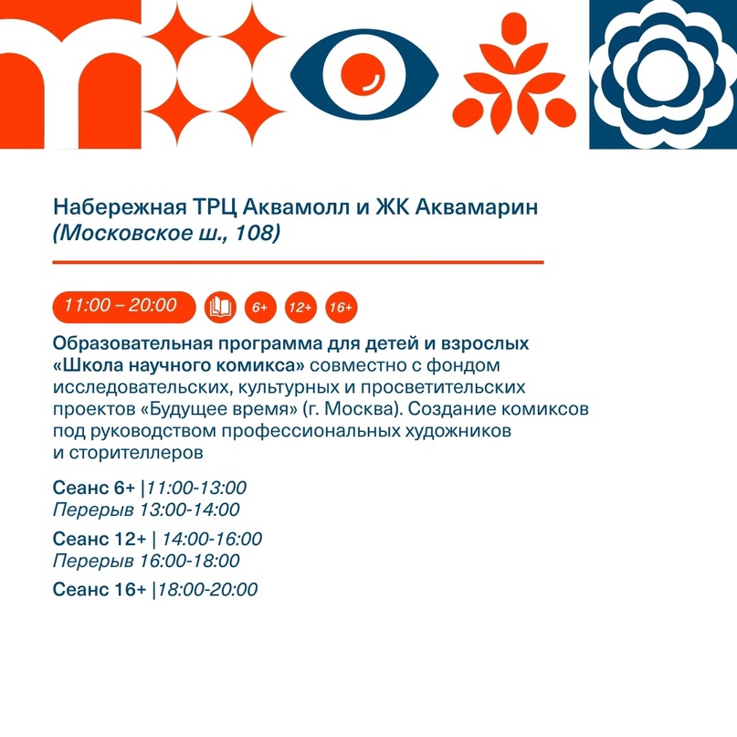 Образовательная программа «Школа научного комикса» совместно с фондом «Будущее время» на набережной ТРЦ Аквамолл и ЖК Аквамарин. Участие бесплатное, но необходима регистрация по ссылке.