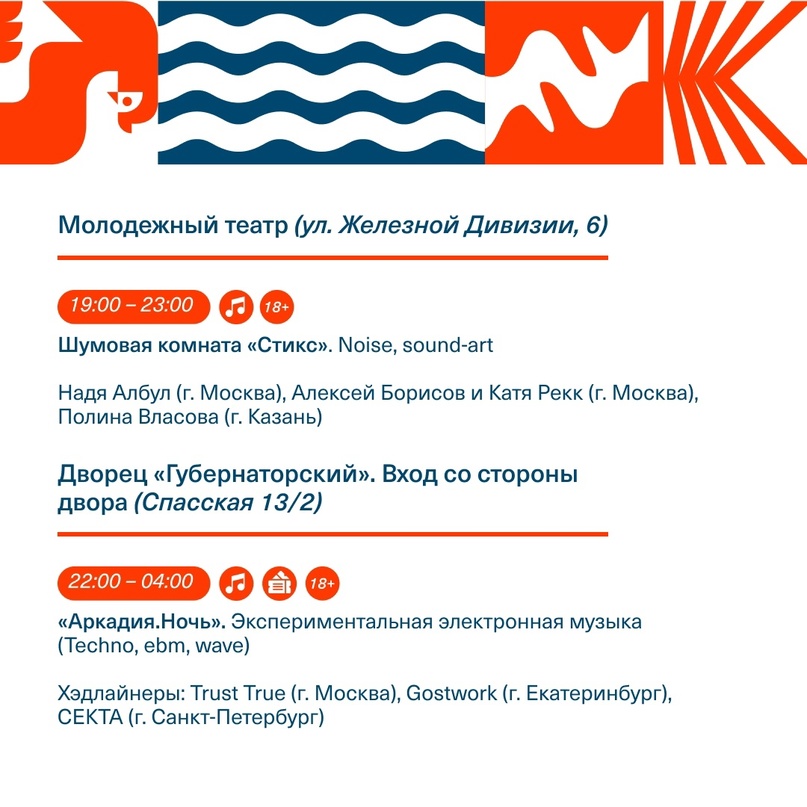 Шумовая комната «Стикс» с 19:00 до 23:00 в Молодежном театре. Экспериментальная электроника, в которой примут участие нойз-музыканты, саунд-артисты, перформеры, представители музыкального авангарда Москвы и Казани. Регистрация по ссылке.