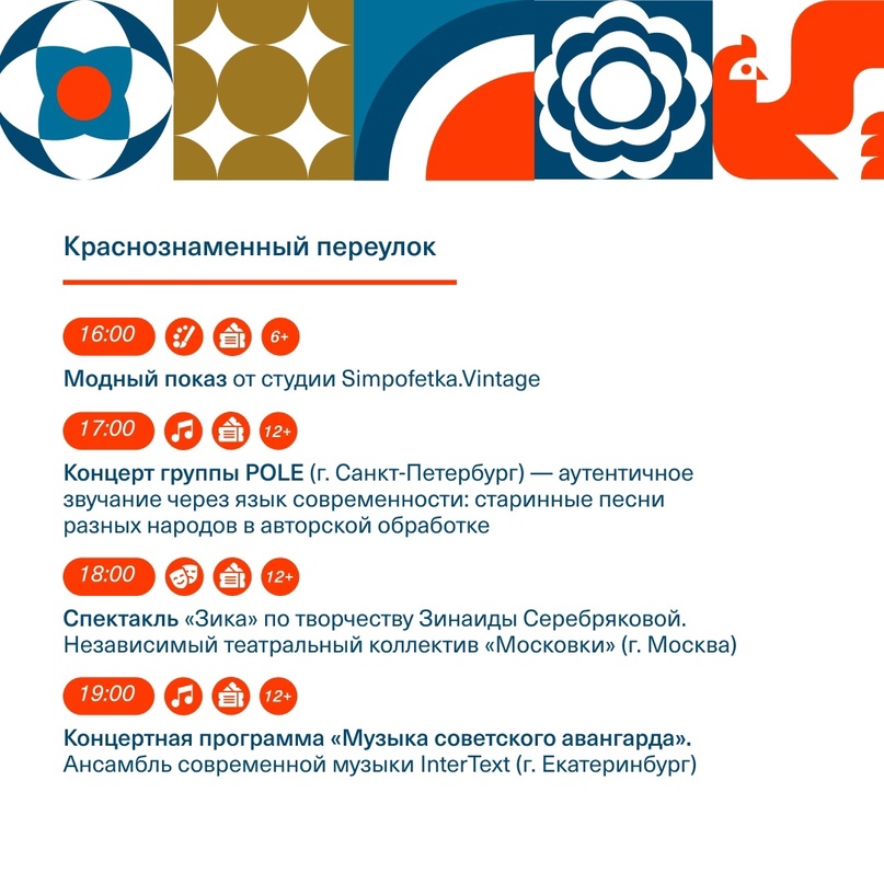 Группа POLE, ансамбль современной академической музыки InterText, спектакль «Зика» по творчеству Зинаиды Серебряковой и модный показ от студии Simpofetka Vintage на Краснознаменном переулке.