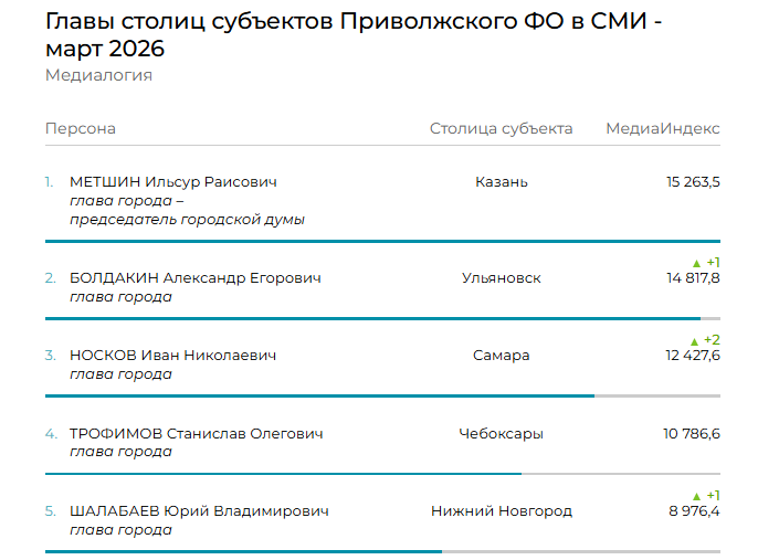 Компания «Медиалогия» представила медиарейтинг первых лиц столиц субъектов Приволжского федерального округа за март 2026 года — система подсчитывала цитируемость 28 управленцев в СМИ, определяя их медиа-индекс.