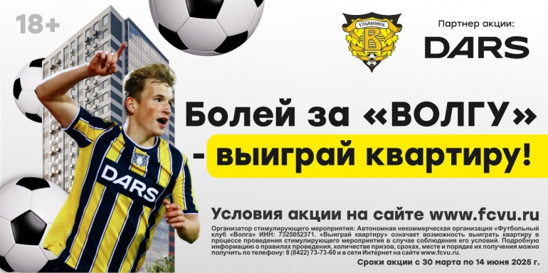 И для своих верных поклонников ульяновский клуб и компания DARS приготовили сюрприз — шанс выиграть квартиру! Условия просты: нужно посетить три домашних матча команды до 1 июня 2025 года и зарегистрироваться в специальном телеграм-боте @boleemzavolgu_bot, чтобы получить уникальный код болельщика. Нужно сделать фото во время домашних матчей в специальной промо-зоне на стадионе. При этом нужно помнить: необходимо, чтобы было видно участника конкурса и дату матча.