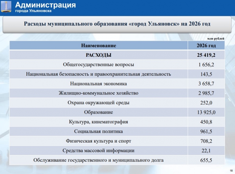 В 2026 году общий объем бюджета планируется в 25,4 млрд, из которых 13 млрд поступят из областного бюджета. Расходы будут выше уровня первоначального бюджета на этот год на 9%, но доходы не превысят.