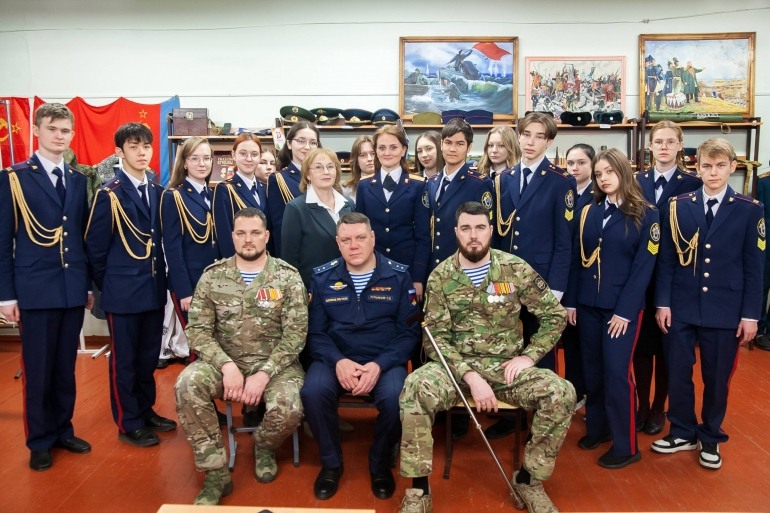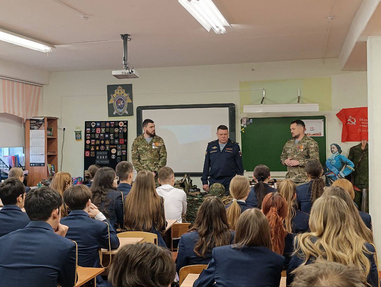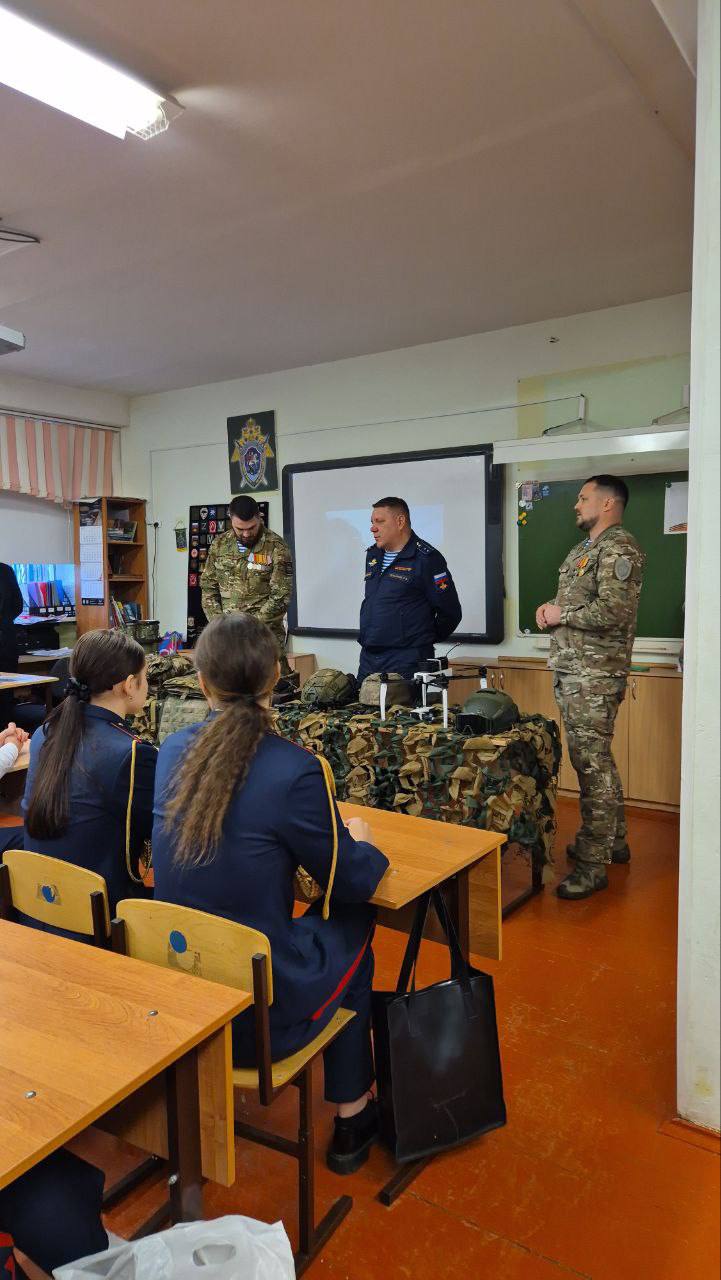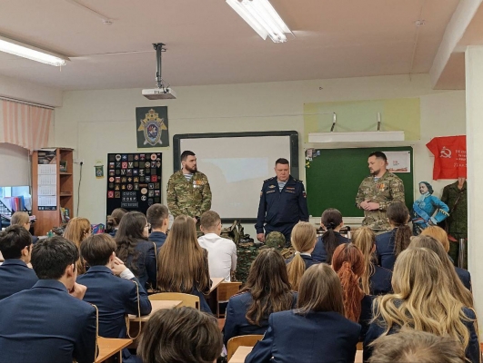 Они рассказали ученикам-кадетам Следственного комитета, как началась специальная военная операция, показали экипировку и снаряжение, которое используется в зоне боевых действий.