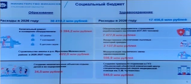 На отрасль здравоохранения в 2026 году предусмотрели ₽17,5 млрд. Из них ₽7,5 млрд пойдет на бесплатную медпомощь 631 тысячи неработающих граждан, на обеспечение льготными лекарствами выделено ₽2,1 млрд, а на модернизацию первичного звена здравоохранения — ₽556,9 млн — из них за ₽25,9 млн планируется выполнить капитальный ремонт здания поликлиники Тереньгульской районной больницы.