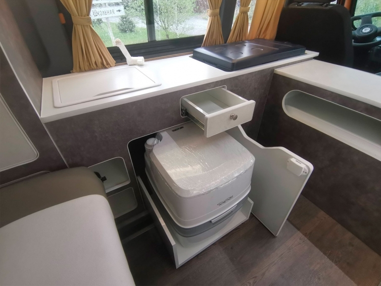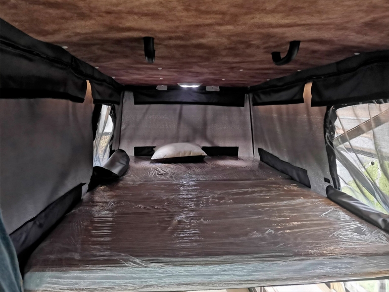 Вся мебель изготовлена из облегченной фанеры с прочной водостойкой ламинацией HPL-пластиком. Модель дополнили крышей из стеклопластика с подъемным механизмом, амортизаторами и фиксаторами в закрытом положении. У авто есть пластиковые окна, москитные сетки и LED подсветка по периметру салона.