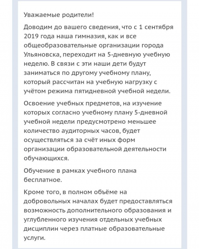 - Все школы Ульяновска с нового учебного года перейдут на пятидневную учебную неделю. В течение года в образовательных организациях проводилось анкетирование самих учащихся и их родителей. Анализ данных наглядно продемонстрировал, что большинство детей и родителей высказываются за переход на пятидневку. Сейчас в школах города составляются учебные планы, рассчитанные на пятидневную рабочую неделю в рамках школы полного дня, - пояснили в пресс-службе горадминистрации, добавив, что в управление образования не поступали сведения о конфликтах в школах в связи с переходом на пятидневку.