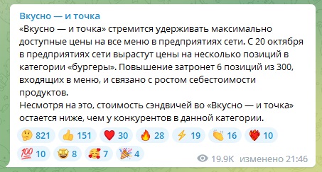 По официальному сообщению компании, опубликованному накануне вечером в ТГ-канале, подорожание затронет «6 позиций из 300, входящих в меню» – только бургеры, как продающиеся отдельно, так и в составе комбо. Издание Mash также писало о повышении цен в сети (на 7-10%), но в ином ключе: якобы подорожание будет происходить без предварительного информирования посетителей, предупреждение получили только директора и менеджеры предприятий.
