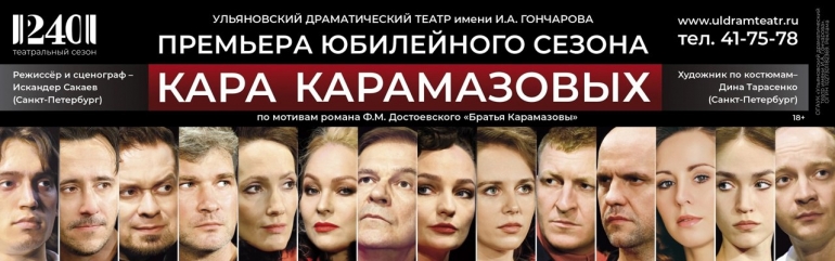 Ульяновский театр драмы им. И. А Гончарова официально откроет сезон 4 сентября в 18.00. Новый сезон — юбилейный и открытие соответствующее. На Основной сцене пройдёт театрализованное представление, посвящённое 240-летию одного из старейших театров России. Представят панораму истории театра, покажут отрывки из старых и спектаклей и грядущих премьер, на сцену артисты будут выходить под живую музыку в исполнении Ульяновского государственного академического симфонического оркестра. Отдельная праздничная программа на театральной площади и в фойе театра. Чтобы её увидеть придётся прийти пораньше — в 17.15. Уже в первые выходные сентября — 5-го в 18.00 и 6-го в 17.00 — первая громкая премьера юбилейного сезона улдрамы — «Кара Карамазовых» (18+) по мотивам финальных глав романа Достоевского «Братья Карамазовы». Постановщик — режиссер из Санкт-Петербурга Искандера Сакаев, который уже знаком ульяновским театралам по спектаклям «Чайка», «Сирано де Бержерак», «Ромео и Джульетта». В главных ролях зрители увидят Виктора Чукина, Илью Полякова, Станислава Пигалёва, Александра Курзина, Николая Авдеева, Александра Лемехова, Оксану Романову, Юлию Ильину, Анну Дулебову и других. А самая необычная роль у Максима Копылова. Он играет... Чёрта. Купить билеты здесь.