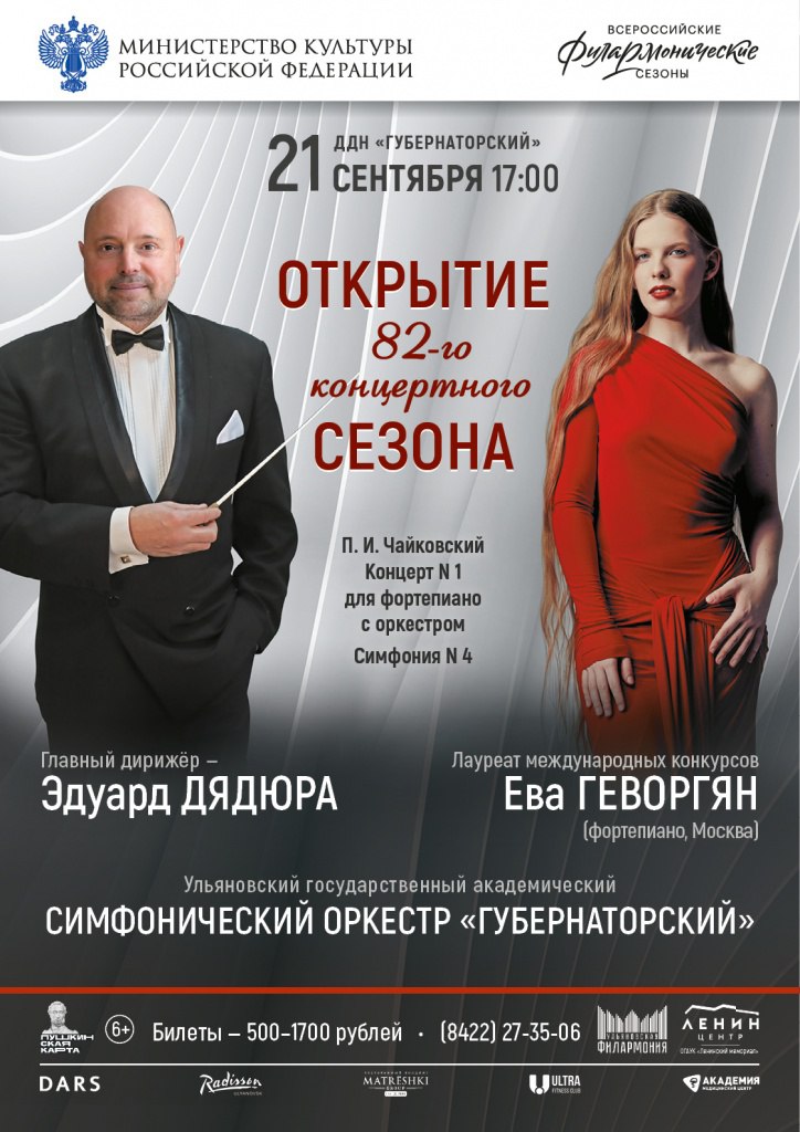 Вторая половина сентября — традиционно время открытий сезонов трёх главных оркестров. 21 сентября в 17.00 в ДК «Губернаторский» концертный сезон откроет Ульяновский государственный академический симфонический оркестр. В программе: Четвёртая симфония и Первый концерт Чайковского (6+). Дирижёр — Эдуард Дядюра. При участии пианистки из Москвы Евы Геворгян. Билеты от 500 до 1700 рублей, купить можно здесь.