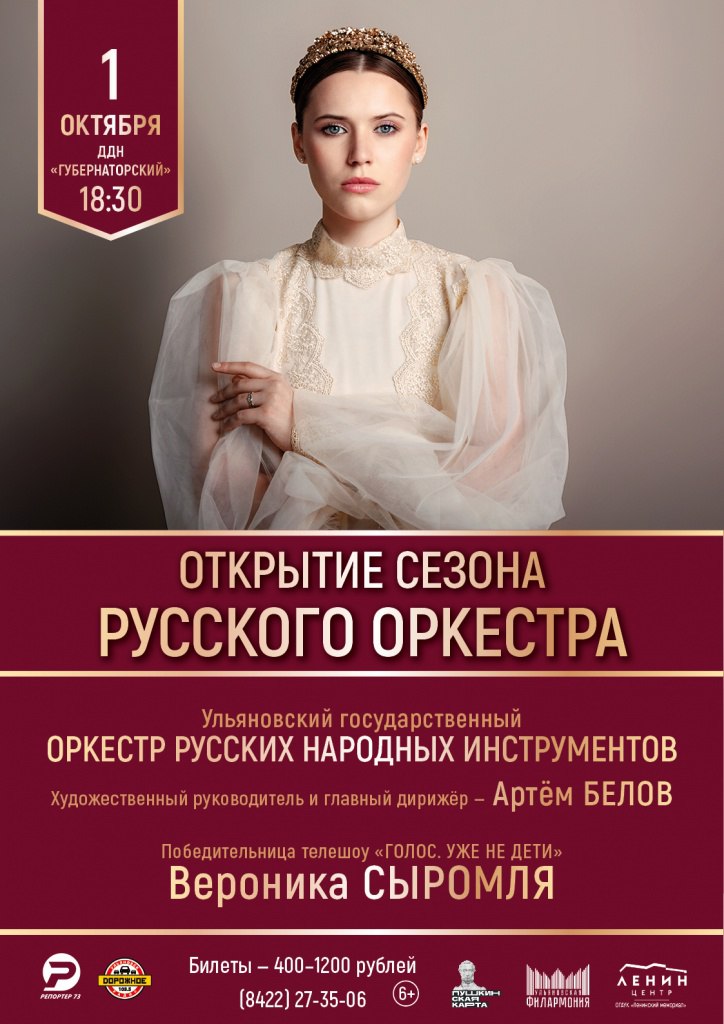 А в первый день октября в 18.30 в ДК «Губернаторский» настанет черёд открывать сезон Ульяновскому государственному оркестру русских народных инструментов. Вместе с коллективом выступит победительница телешоу «Голос. Уже не дети» Вероника Сыромля (6+). Билеты от 400 до 1400 рублей, купить можно здесь.