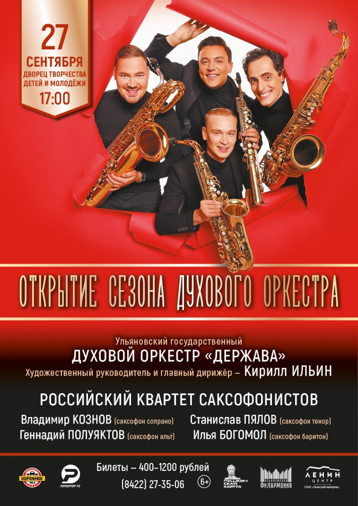 Духовой оркестр «Держава» откроет сезон 27 сентября в 17.00 во Дворце творчества детей и молодёжи. В качестве группы поддержки — Российский квартет саксофонистов: Владимир Кознов, Геннадий Полуяктов, Станислав Пялов и Илья Богомол (6+). Билеты от 400 до 1200 рублей, купить можно здесь.
