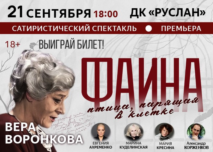 21-го в ДК «Руслан» в 18.00 спектакль о легендарной Раневской «Фаина, птица парящая в клетке» (18+) с участием звёзд театра и кино Веры Воронковой, Александра Корженкова, Марины Куделинской и других. Билеты от 1500 до 3500 рублей, купить можно здесь.