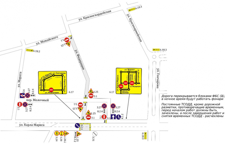 Также полностью закроют проезд на Федерации – на участке между Карла Маркса и переулком Молочным.