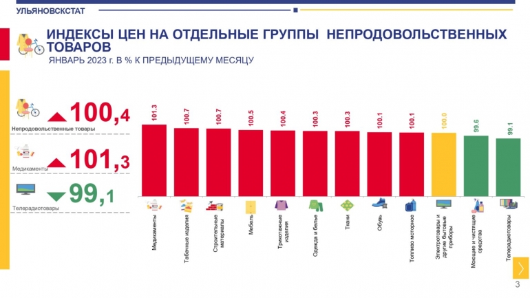 В группе непродовольственных товаров фиксируется рост цен на медикаменты (+1,3%) и снижение цены на телерадиотовары (-0,9%). Моющие средства также просели в цене на 0,4%.