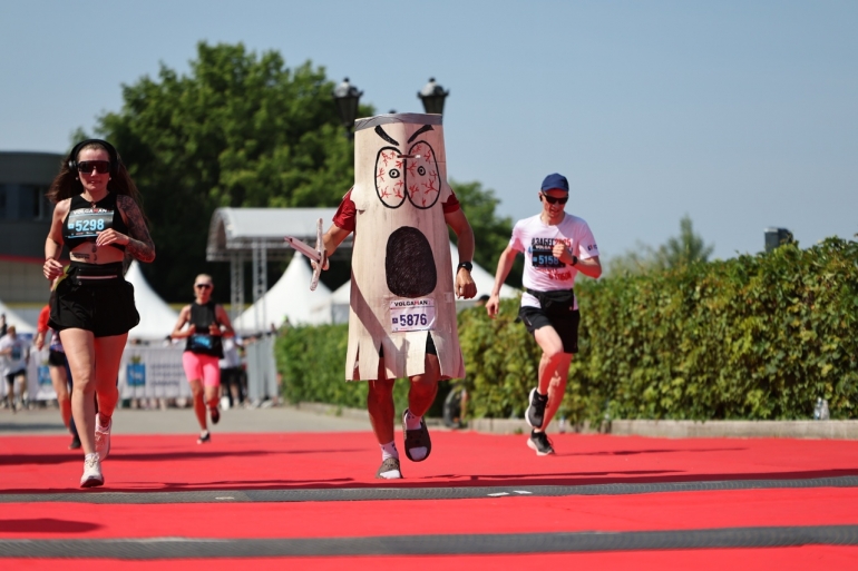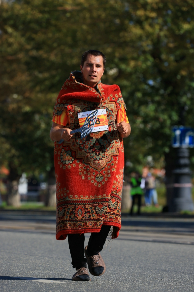 — Чем абсурднее, тем лучше. Я смотрю, чтобы в интернете никто раньше так не бегал, и если не нахожу — значит, буду первым, — говорит Евгений. — Идеи для образов приходят спонтанно. Например, в прошлом году гулял по Казани и увидел, как кто-то выбросил ковер. Я подумал: а что, если? Купил похожий на «Авито», сделал костюм — и пошло.