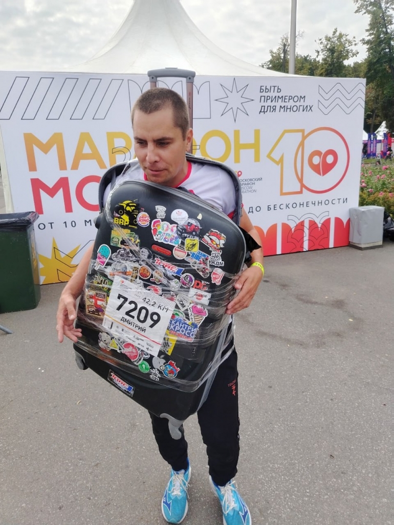 Сегодня в Москве прошел 12-й международный марафон. Тысячи бегунов вышли на старт, в том числе и 36-летний предприниматель из Ульяновска Евгений Верлос. Он не показал рекордных секунд и не попал в призеры, однако это не помешало ему стать одним из главных ньюсмейкеров марафона: на дистанцию он вышел в обнимку с настоящим дорожным чемоданом.