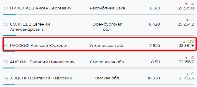 Губернатор Ульяновской области Алексей Русских в октябре занял 32 строчку рейтинга с индексом 32381,9, поднявшись за месяц вверх на 39 позиций.
