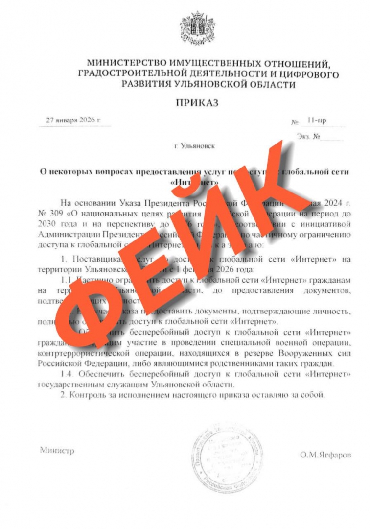 — Приказ — грубо сверстанная подделка. В нем нарушены правила юридической техники, встречаются орфографические и лексические ошибки. В качестве примера: фейкоделы предлагают обеспечить доступ в интернет «гражданам, берущим участие в проведении специальной военной операции». Министр имущественных отношений, градостроительной деятельности и цифрового развития Ульяновской области Олег Ягфаров также подтвердил, что подобного приказа не существует, - сообщили в Центре управления регионом.